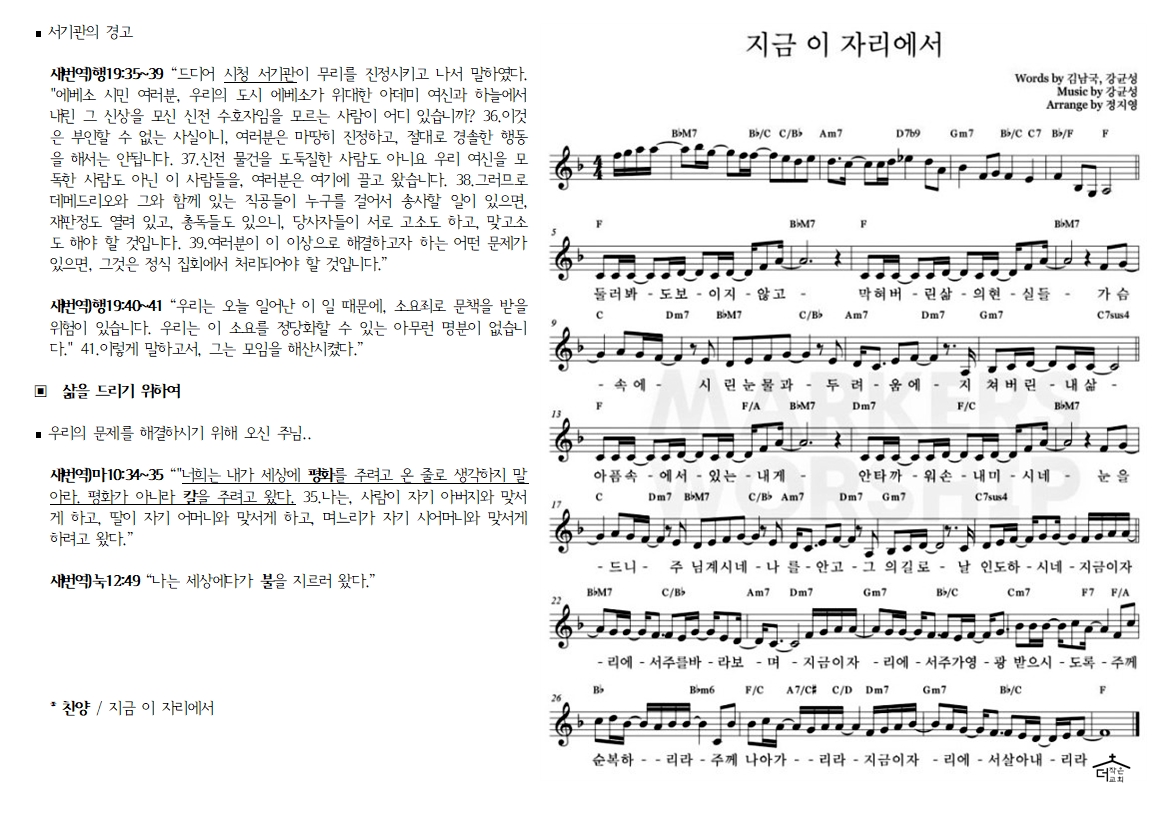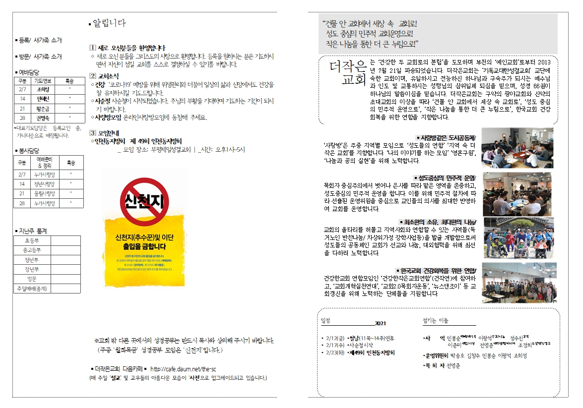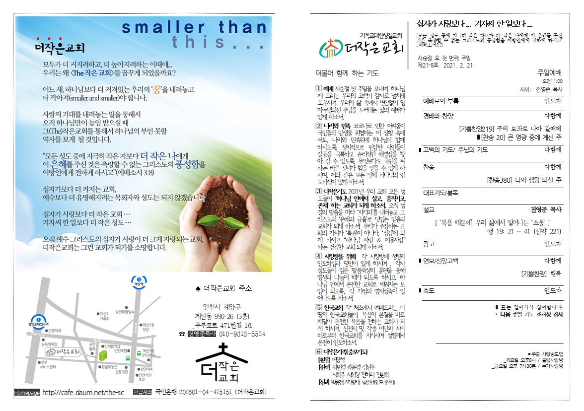 | [더작은교회] 주일예배 (2/21) (행19:21~41) | ‘복음 때문에’ 우리 삶에서 일어나는 ‘소동’... | 전영준목사 | 2021-02-21 | |||